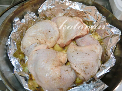 クレージーソルトをまぶして丸一日寝かせた鶏肉を載せてオリーブオイルを塗ります。