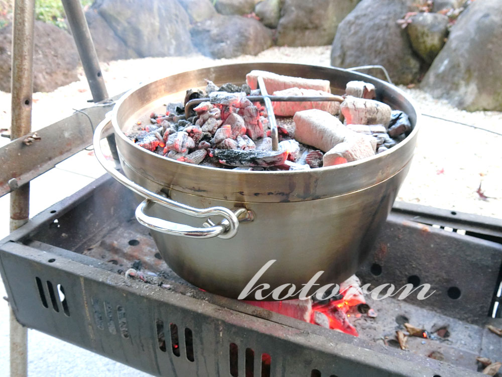 ダッチオーブンで1時間半加熱(最初は弱火、1時間たったところで様子を見て、焦げ目がなったので、最後の30分は上側を強火に変更)。