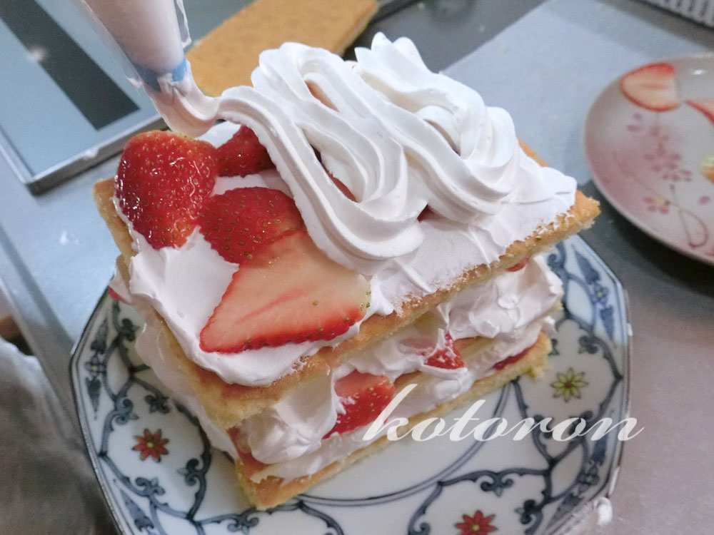 それをさらに半分に切ってクリームといちごを挟んでいきます。