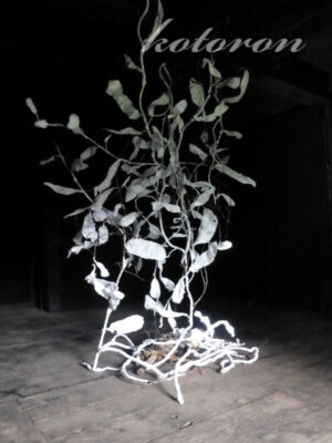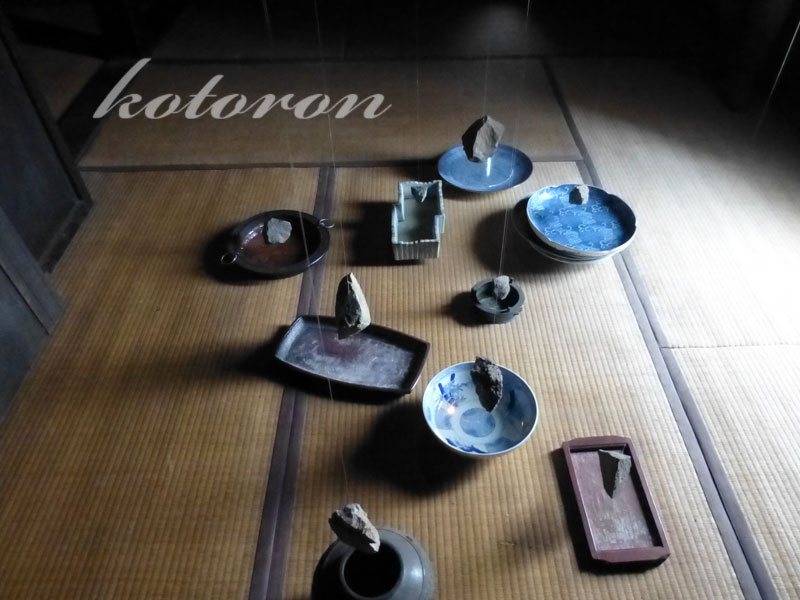 古い、波打った畳の上に作品。